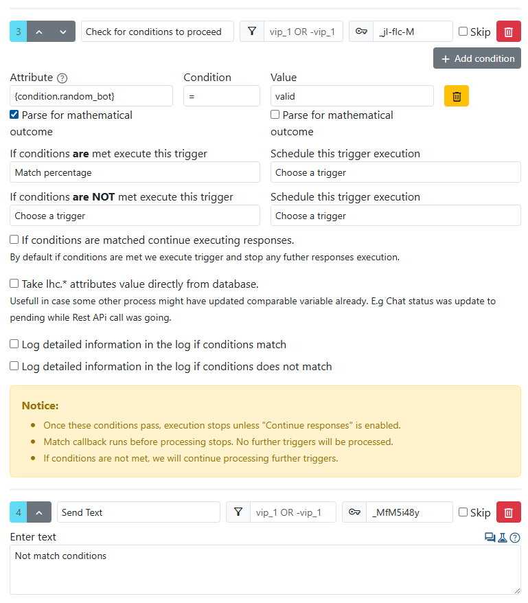 If conditions are matched continue executing responses.This is required if you are usingIf conditions are met execute this trigger