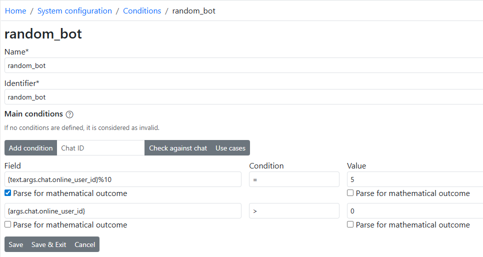 So if you set variablebot_touchedin attribute field you can use eitherbot_touchedor{args.chat.chat_variables_array.bot_touched}{args.chat.<main chat attr>}or{args.msg.msg}you can use text matching for visitor message.online_departmentuse as attribute to check is department online (respects department online hours and operators online statuses). In value field 1 means online, 0 - means offlineonline_department__<dep_id_1>,<dep_id_2>- You can check other department online status by following example. E.gonline_department__5it would check department with id 5 online status.